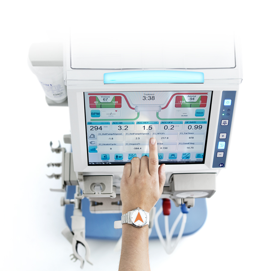 Dialysmonitor för HD med användarpanel monterad på arm, utan online-funktion. Kan med fördel användas för hem- och självdialys.