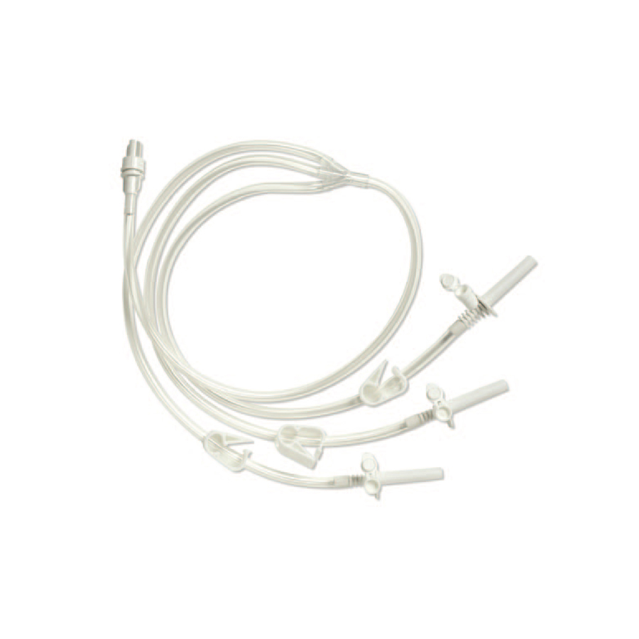 Beredningsaggregat för gravitation. För anslutning av upp till tre lösningar, ansluts direkt till TPN-påsar. Varje slang kan stängas separat.