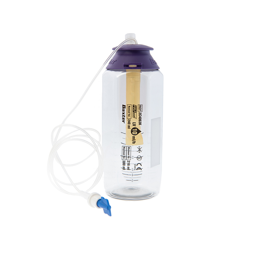 Bärbar infusionspump för engångsbruk. En elastomerisk ballong pressar ut läkemedlet. Infusionshastigheten kontrolleras av en flödesrestriktor och infusionen avstannar när pumpen är tömd.