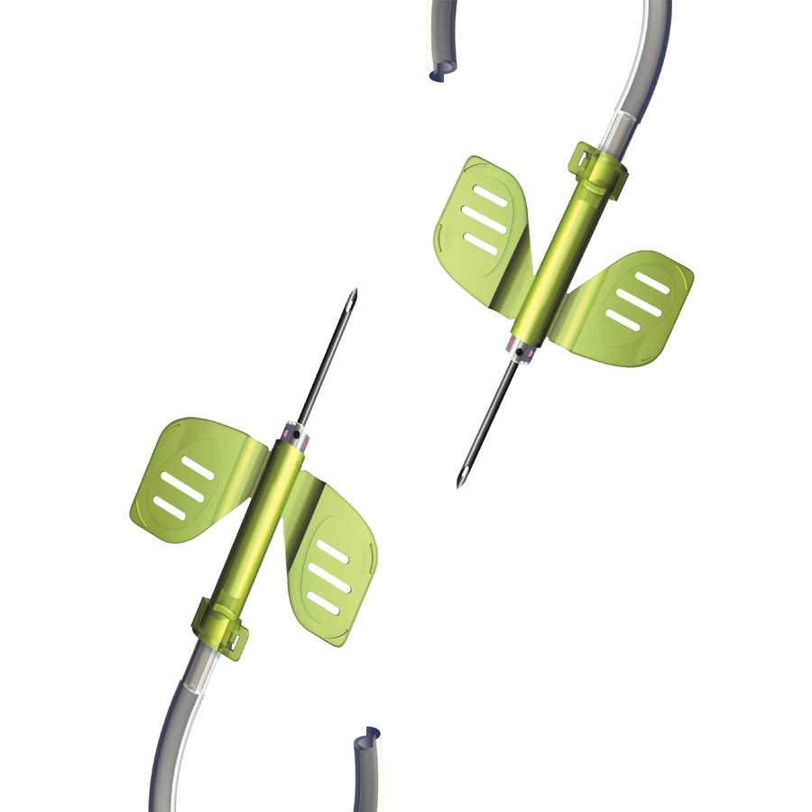 Dialysnål med stickskydd och roterbara vingar. Sampackad artär- och vennål.